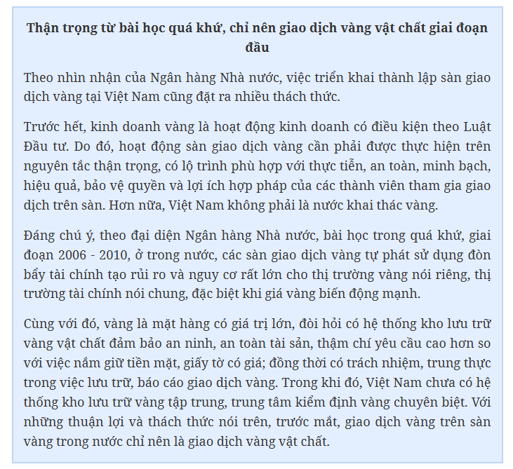Cùng chung quan điểm, ông Nguyễn Minh Tuấn - CEO AFA Capital, sáng lập nền tảng tài chính TOPI cho rằng, Việt Nam cần hướng đến sở giao dịch vàng vật chất quốc gia, một mô hình hoàn toàn khác, dựa trên giao dịch thật, có tiêu chuẩn quốc gia và cơ chế giao nhận minh bạch, khác với “sàn vàng” từng gây thiệt hại cho nhà đầu tư 10 năm trước, khi giao dịch chỉ dựa trên chênh lệch giá mà không có vàng thật. Việt Nam nên tham khảo mô hình Thượng Hải, Trung Quốc và Hiệp hội Thị trường Vàng thỏi London (LBMA), Vương quốc Anh, nơi có lô chuẩn, trung tâm giao nhận và hệ thống ký gửi chuyên nghiệp.