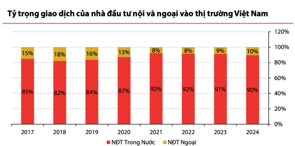 Thị trường Việt Nam cũng không ngoài vòng xoáy đó khi liên tục bị khối ngoại bán và rút ròng mạnh mẽ. Trong 2 phiên giao dịch đầu năm 2025, khối ngoại cũng đã bán ròng hơn 820 tỷ tính riêng trên sàn HOSE, trong đó nhóm bị bán mạnh đều là nhóm cổ phiếu “hot” đối với khối ngoại như FPT, MWG, HDB, TCB, CTG… Trong bối cảnh thanh khoản thấp, việc khối ngoại bán ròng mạnh và tập trung ở các cổ phiếu hot lại làm tăng tâm lí thận trọng đối với toàn thị trường. Trong 2024, tỷ trọng giao dịch của khối ngoại cũng tăng trở lại trên mức hơn 10% khiến cho sức ép lên thị trường cũng dễ cảm nhân được.