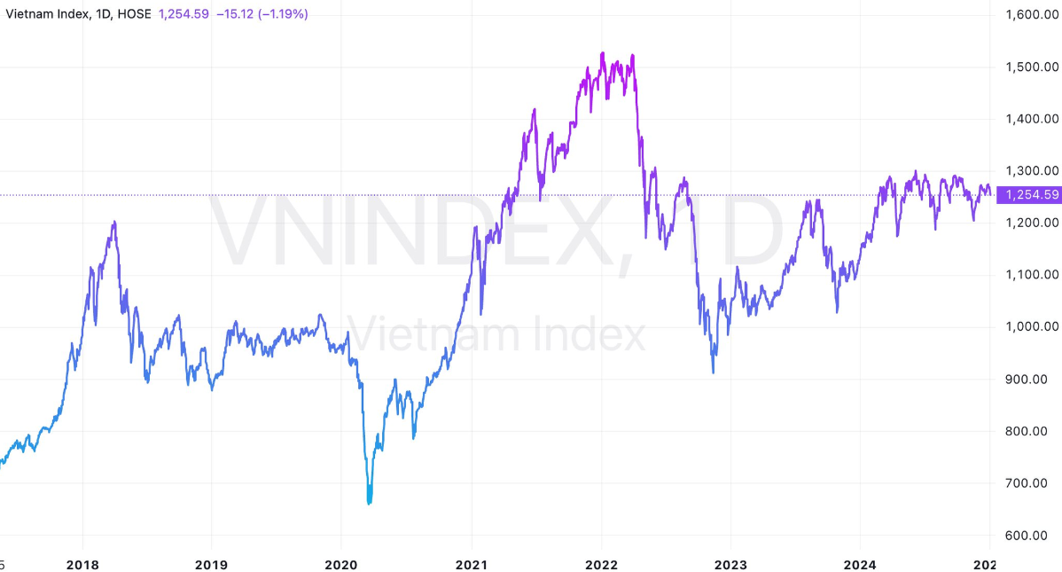 Trong bối cảnh VN-Index vẫn đang dao động trong kênh giá 1.200 – 1.300 điểm kéo dài từ giữa năm 2024 cho tới nay, thị trường sẽ cần trợ lực từ các thông tin hỗ trợ và thanh khoản gia tăng để có thể bứt phá ra khỏi vùng kênh giá kể trên. Giai đoạn hiện tại, thanh khoản chưa có nhiều cải thiện và vẫn ở mức tương đối thấp. Nhà đầu tư vẫn đang lo ngại các yếu tố rủi ro về tỷ giá có thể sẽ là lực cản khiến thị trường gặp khó khăn trong việc bứt phá khỏi vùng kháng cự 1.300 điểm. Chuyên gia cho rằng thị trường sẽ chưa thể bứt phá ngay khỏi vùng kháng cự kể trên và sẽ tiếp tục có các nhịp điều chỉnh, tái tích lũy từ bây giờ cho tới Tết. Nhà đầu tư có thể tận dụng các nhịp điều chỉnh này để tích lũy dần các cổ phiếu tốt với mặt bằng giá hấp dẫn.