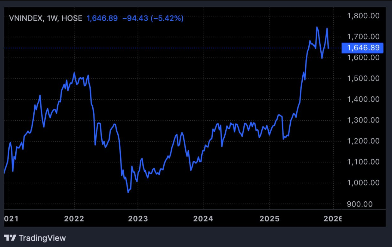 VN-Index vừa trải qua một tuần giảm sốc khi mất hơn 94 điểm, đánh dấu nhịp điều chỉnh mạnh nhất kể từ tháng 4. Diễn biến này trái ngược hoàn toàn với xu hướng tích cực của thị trường chứng khoán thế giới, khi cả Dow Jones và S&P 500 đồng loạt lập đỉnh lịch sử mới.