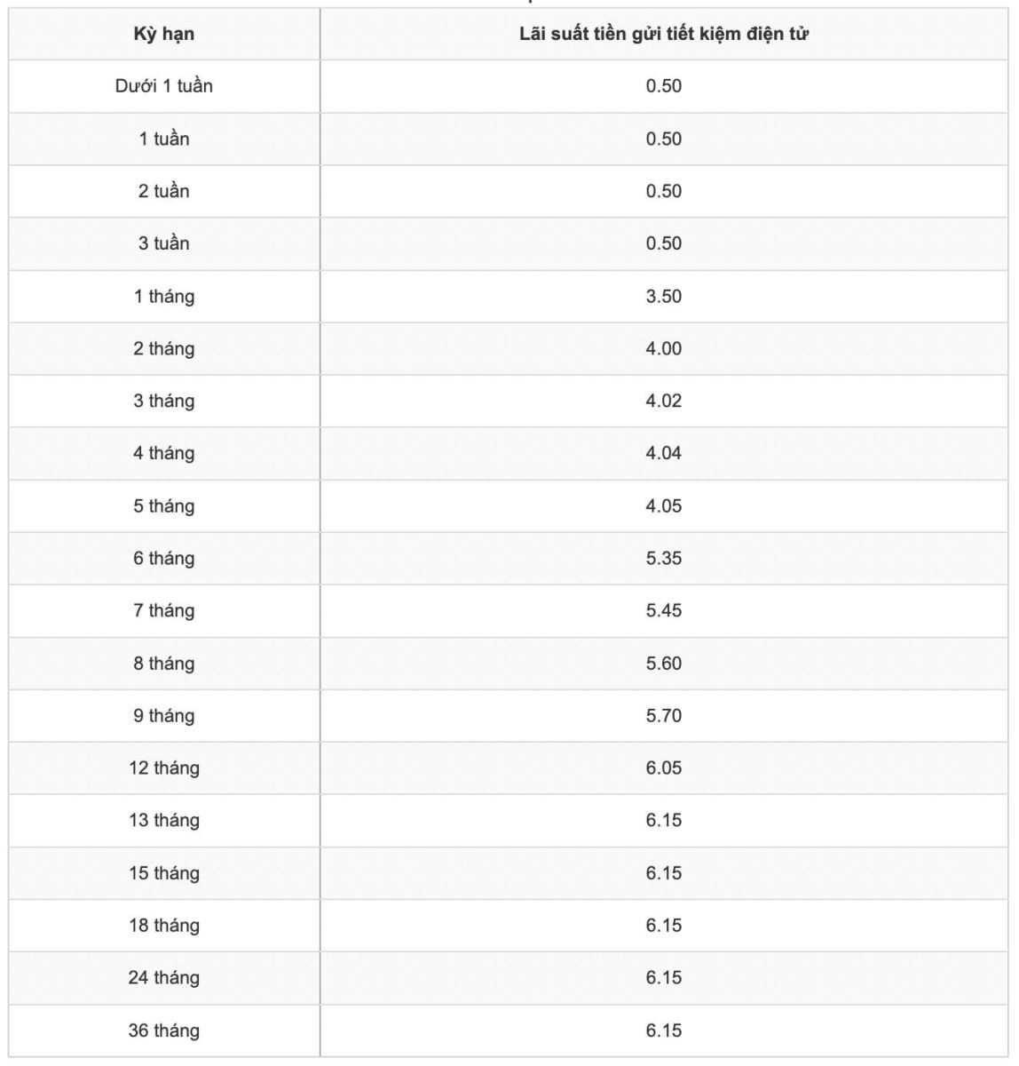 GPBank đang niêm yết lãi suất cao nhất 12 tháng ở mức 6,05%/năm cho khách hàng gửi tiết kiệm điện tử. Hiện mức lãi suất cao nhất ngân hàng này niêm yết là 6,15% ở kỳ hạn 13 - 36 tháng.