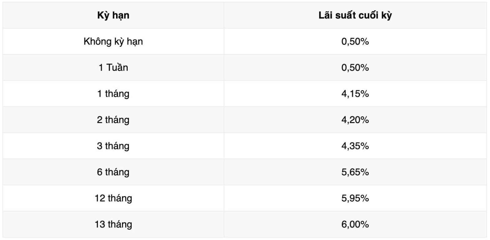 Vikki Bank đang niêm yết lãi suất 12 tháng cao nhất ở mức 5,95% khi khách hàng gửi tiền online, nhận lãi cuối kỳ. Ở các kỳ hạn khác, Vikki Bank đang niêm yết lãi suất từ 0,5-6%/năm.