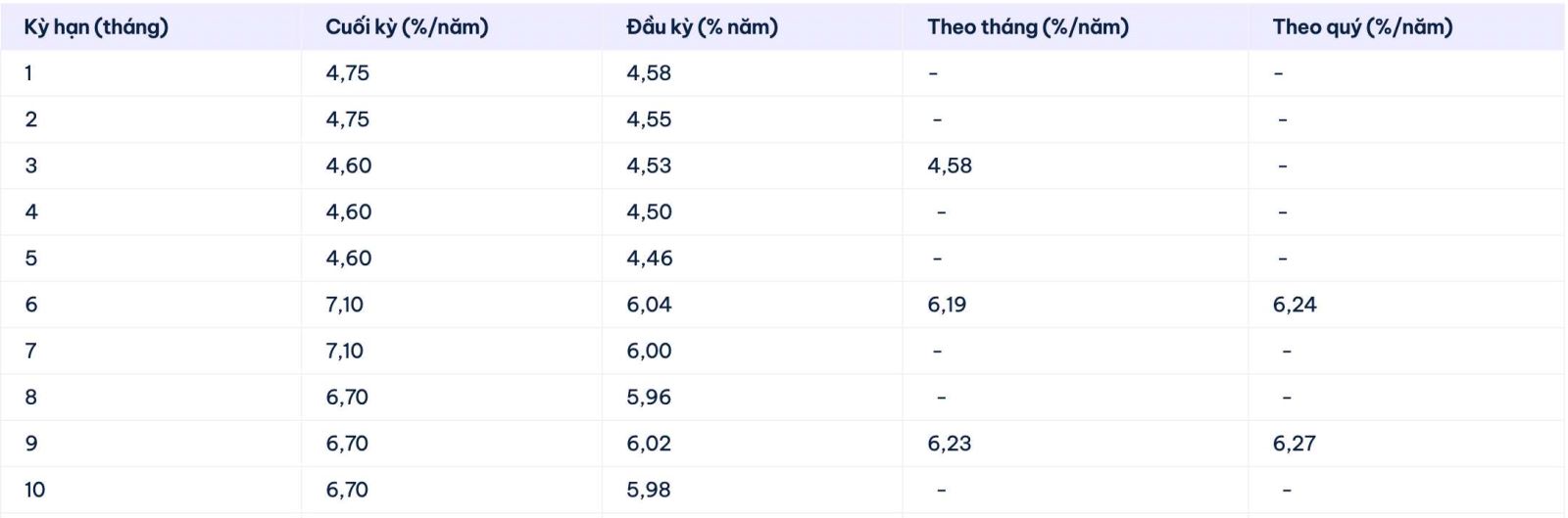 Đầu tiên, Cake by VPBank đang niêm yết lãi suất cao nhất kỳ hạn 6 tháng ở mức 7,1%/năm khi khách hàng nhận lãi cuối kỳ. Khi khách hàng nhận lãi đầu kỳ, theo tháng và theo quý sẽ nhận được lãi suất lần lượt ở mức 6,04% và 6,19% và 6,24%/năm.