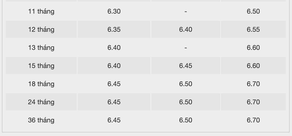 Vikki Bank đang niêm yết lãi suất cao nhất kỳ hạn 6 tháng ở mức 6,5%/năm khi khách hàng gửi tiền online, lĩnh lãi cuối kỳ. Kỳ hạn cao nhất đơn vị này đang niêm yết lãi suất cao nhất là 13 tháng, ở mức 6,7%.