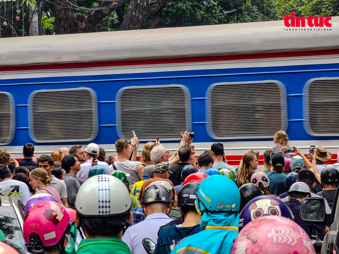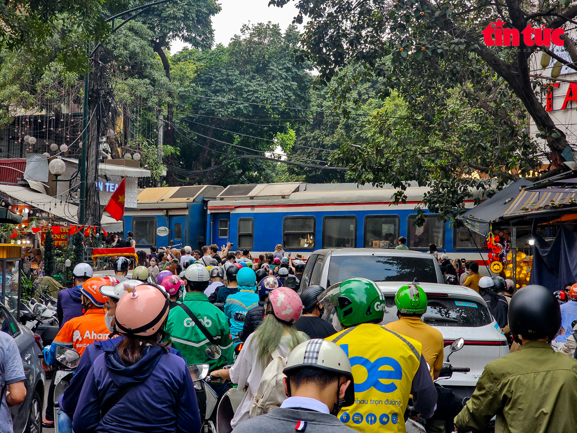 Du khách tham quan được CSGT mời di chuyển ra khỏi khu vực tàu chạy.