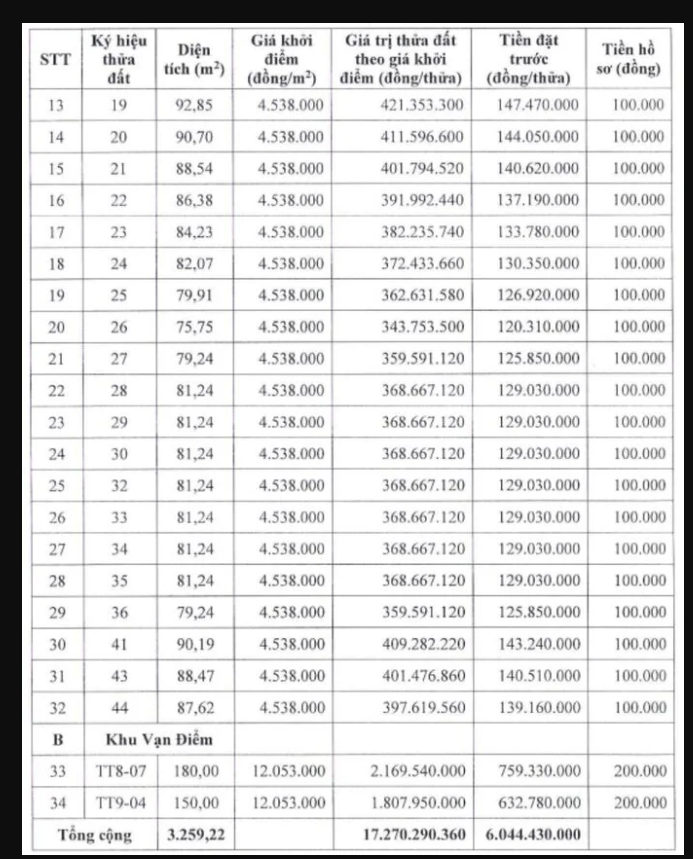 Theo thông báo, các thửa đất đưa ra đấu giá có diện tích từ 73,79 đến 180m2. Giá khởi điểm được chia thành hai mức, trong đó 32 thửa đất tại khu Bà Hòa 2 có giá khởi điểm 4.538.000 đồng/m2, còn 2 thửa đất tại khu Vạn Điểm có giá khởi điểm 12.053.000 đồng/m2.