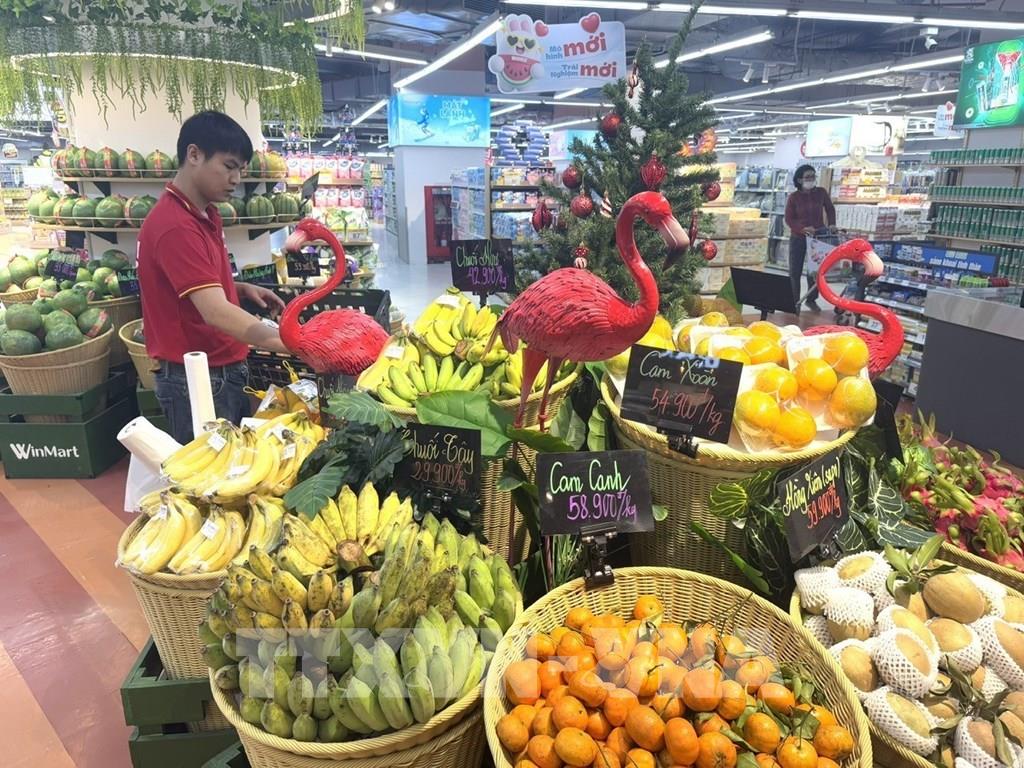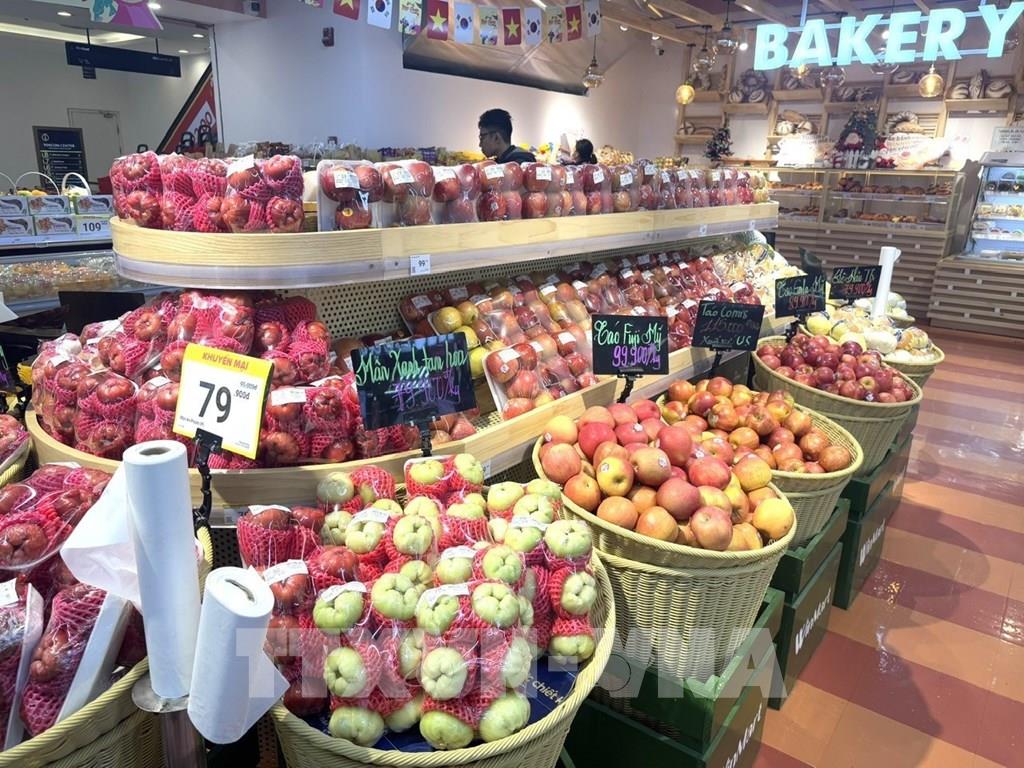 Gian hàng trái cây, hoa quả trong siêu thị được trưng bày bắt mắt, đảm bảo nguồn cung phong phú, phục vụ nhu cầu mua sắm tăng cao dịp Tết. Ảnh: Quốc Lũy - TTXVN