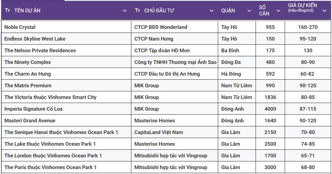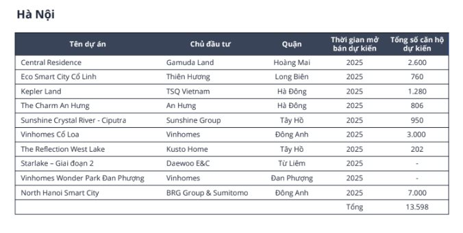 Ngoài các dự án trên, Batdongsan.com.vn cho biết thêm nguồn cung chung cư Hà Nội mở bán năm 2025 được dự báo có cải thiện so với năm trước, với hơn 10 dự án có kế hoạch ra hàng, tổng số lượng mở bán dự kiến lên tới hàng chục nghìn căn, giá trung bình mở bán lên đến 90 - 100 triệu đồng/m2.