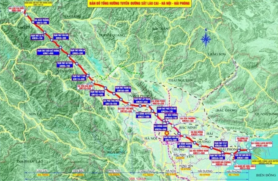 Bản đồ tổng hướng tuyến đường sắt Lào Cai - Hà Nội - Hải Phòng.