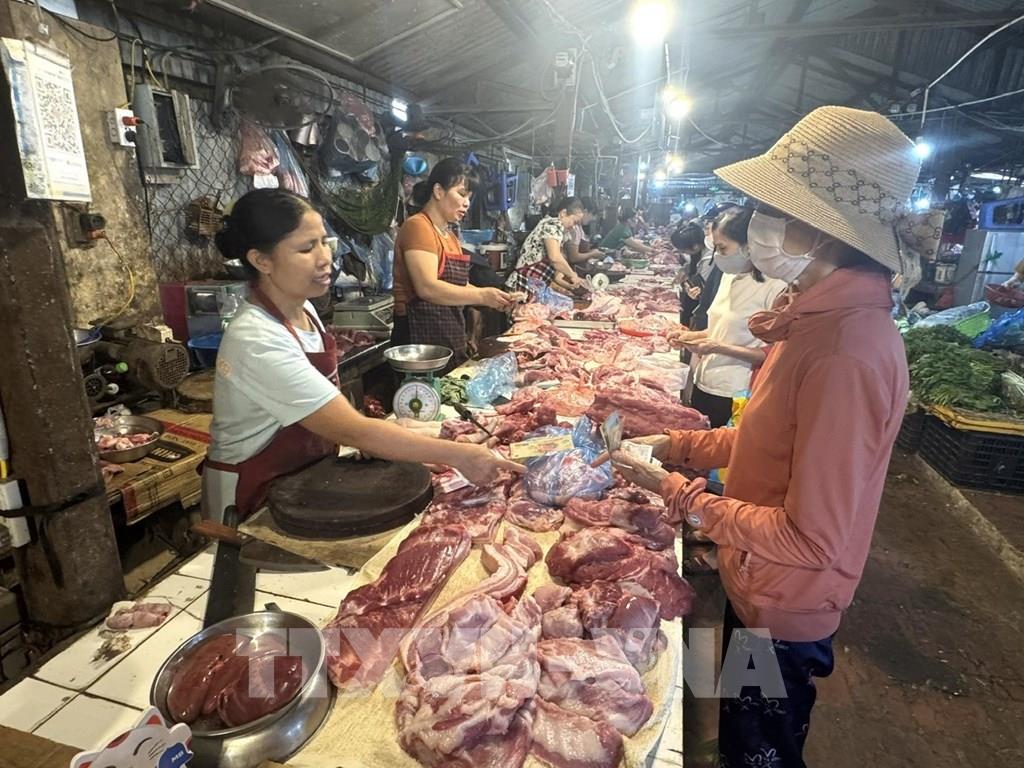 Người tiêu dùng chọn mua thịt lợn trong những ngày ảnh hưởng của bão. Ảnh: TTXVN phát