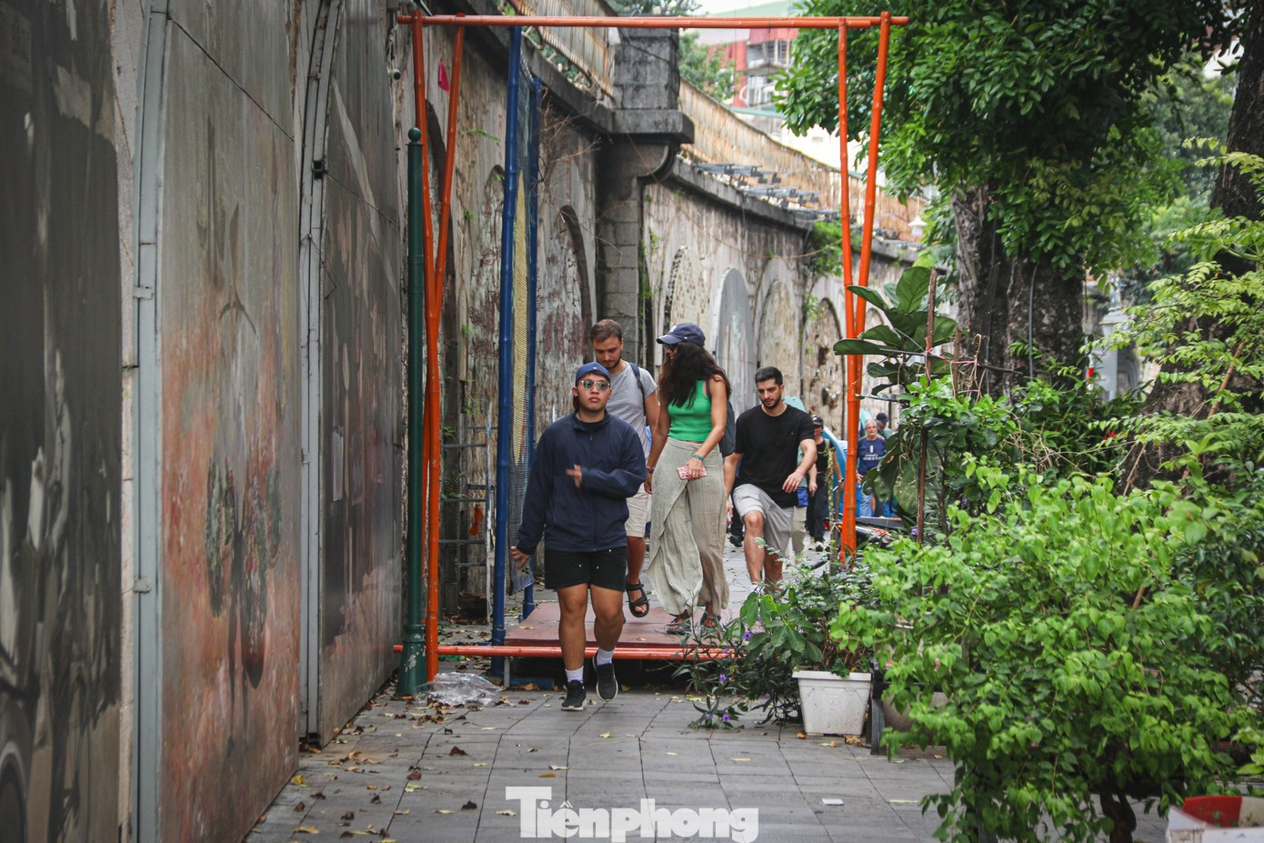 Du khách nước ngoài thăm quan vòm cầu đá dẫn lên cầu Long Biên