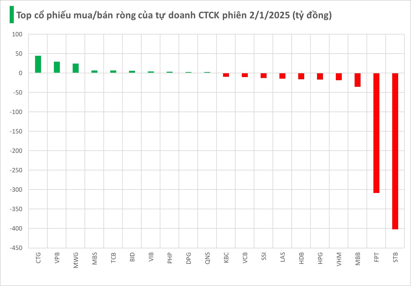 Ngược lại, giao dịch của các CTCK mua ròng 45 tỷ tại CTG. Bên cạnh đó, các cổ phiếu như VPB, MWG, TCB... cũng được mua ròng trong phiên 2/1.