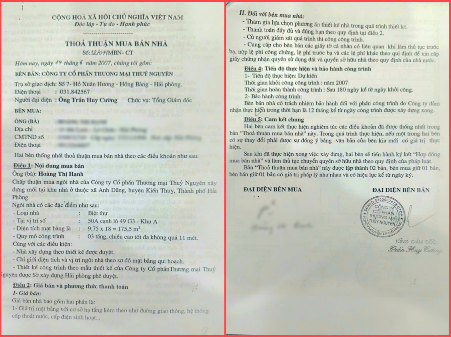 Cụ thể, từ năm 2004, công ty đã ký Hợp đồng thoả thuận mua bán nhà, xuất hóa đơn thu tiền từ khách hàng với phương thức thanh toán chia 2 giai đoạn: nộp đủ tiền mặt bằng trước, sau đó thanh toán phần xây dựng nhà sau khi thống nhất thiết kế. Theo thỏa thuận, sau khi xây xong và hoàn thiện thủ tục, chủ đầu tư sẽ chuyển quyền sở hữu nhà cho khách hàng.