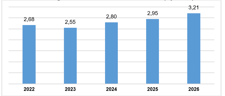 Vốn đầu tư trực tiếp nước ngoài thực hiện hai tháng đầu năm các năm 2022-2026 (tỷ USD).