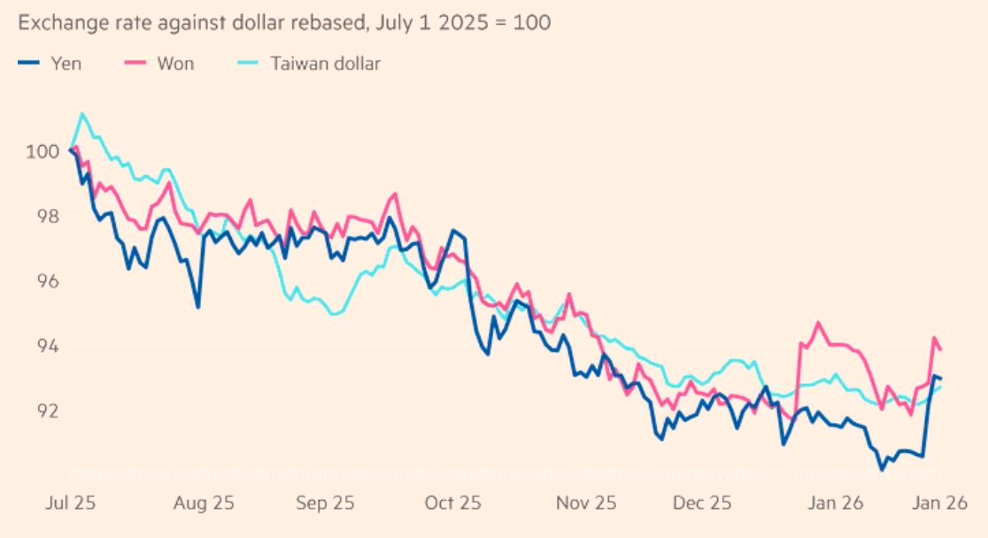 Tại Đài Loan (Trung Quốc), các công ty bảo hiểm nhân thọ đang mua lượng lớn trái phiếu chính phủ Mỹ, đặc biệt sau khi có quy định mới cho phép giảm yêu cầu phòng ngừa rủi ro tỷ giá cho khoản đầu tư ở nước ngoài. Điều này tạo áp lực bán ra đối với đồng nội tệ. Tại Hàn Quốc, giới đầu tư cá nhân cũng đang đổ xô mua cổ phiếu Mỹ, góp phần khiến đồng won suy yếu.