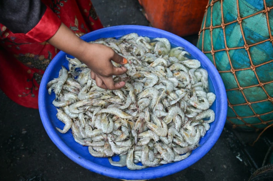 Tôm tươi sống được bày bán ở một ngôi chợ truyền thống tại phía đông đảo Java, Indonesia - Ảnh: AFP