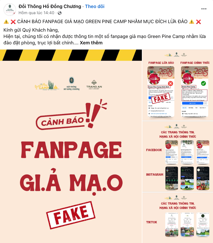 Một khu camping tại Ninh Bình cũng lên tiếng cảnh báo khi bị giả mạo liên tục (Ảnh chụp màn hình)