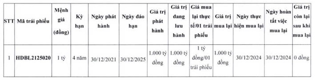Trước đó, trong khoảng thời gian từ ngày 22/12/2024 đến ngày 23/12/2024, HDBank cũng đã hiện mua lại toàn bộ lô trái phiếu mã HDBL2125017 trước hạn. Lô trái phiếu này có mệnh giá 1 tỷ đồng/trái phiếu, tổng giá trị phát hành 600 tỷ đồng, dự kiến đáo hạn ngày 22/12/2025.