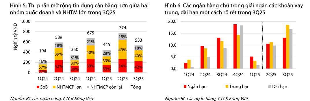 Thị phần mở rộng tín dụng trong đã cân bằng hơn giữa nhóm ngân hàng quốc doanh và ngân hàng thương mại cổ phần lớn trong 3 quý đầu năm 2025.