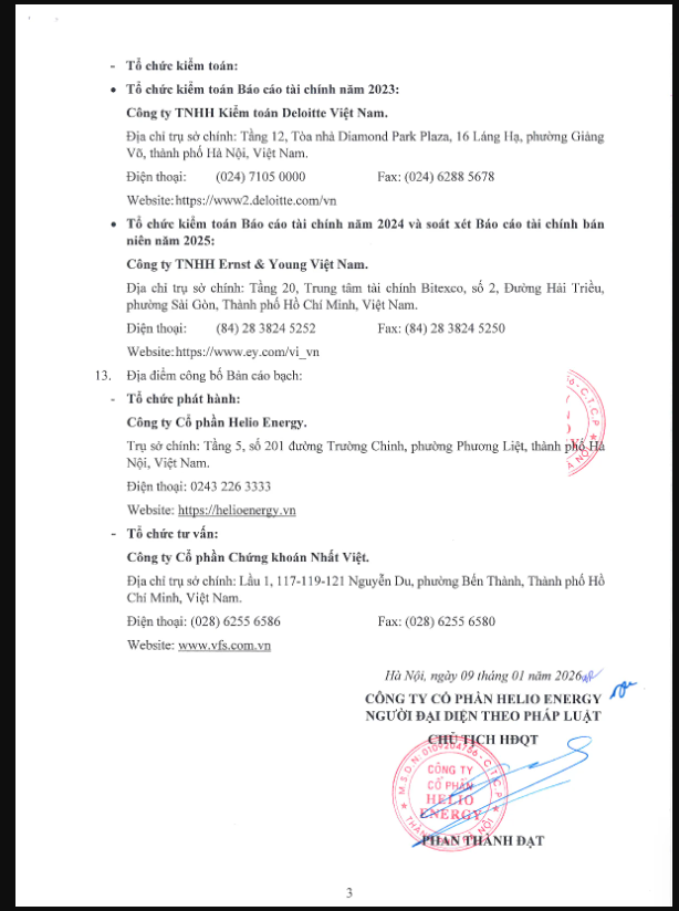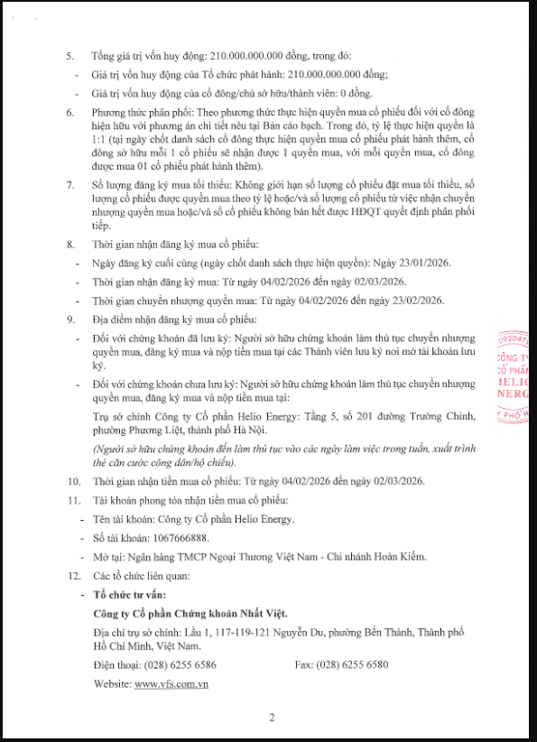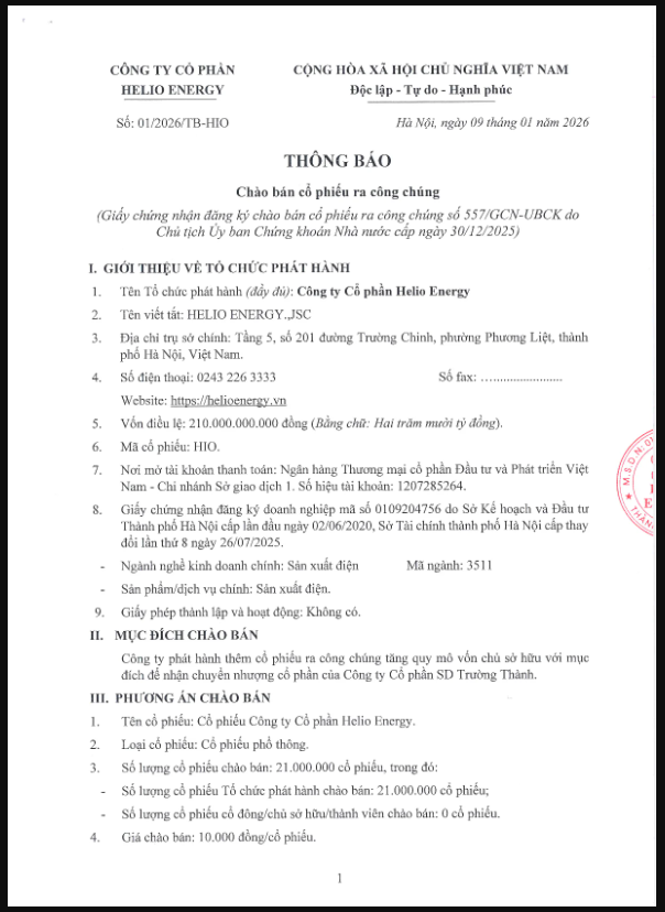 Căn cứ Giấy chứng nhận đăng ký chào bán cổ phiếu ra công chúng số 557/GCN-UBCK do Chủ tịch Ủy ban Chứng khoán Nhà nước cấp ngày 30/12/2025, Công ty Cổ phần Helio Energy (HIO) thông báo chào bán cổ phiếu ra công chúng như sau:
