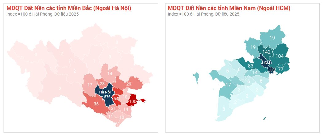 Sự phân hóa này còn thể hiện ở mặt bằng giá. Tại miền Bắc, Bắc Ninh hiện dẫn đầu với giá trung bình 36 triệu đồng/m², Hưng Yên 35 triệu đồng/m², Hà Nam và Hải Dương cùng ở mức 26 triệu đồng/m². Trong khi đó, miền Nam có mặt bằng giá thấp hơn: Bình Dương khoảng 31 triệu đồng/m², Cần Thơ 28,9 triệu đồng/m², và Bà Rịa – Vũng Tàu hay Kiên Giang dao động quanh mức 16 triệu đồng/m².