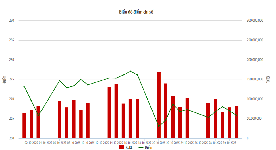 Tháng 10/2025, thị trường cổ phiếu niêm yết trên Sở Giao dịch Chứng khoán Hà Nội (HNX) ghi nhận nhiều biến động đáng chú ý khi chỉ số giá lẫn thanh khoản cùng suy giảm. Kết thúc tháng, chỉ số HNX-Index dừng tại 265,85 điểm, giảm 2,68% so với tháng 9. Mức điểm cao nhất ghi nhận trong tháng là 277,08 điểm, đạt vào ngày 16/10, song đà tăng không duy trì được lâu do áp lực bán gia tăng về cuối tháng.