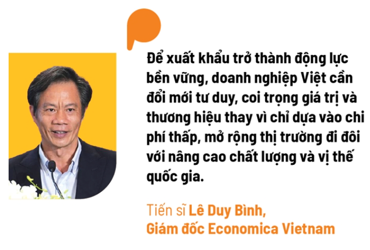Đẩy mạnh số lượng doanh nghiệp Việt tham gia vào chuỗi cung ứng toàn cầu là bài toán của nền kinh tế Việt Nam trong thập kỷ tiếp theo. Tiến sĩ Lê Duy Bình, Giám đốc Economica Vietnam, nhấn mạnh yêu cầu trong giai đoạn tới, doanh nghiệp tư nhân phải tiên phong thay đổi mô hình xuất khẩu trong quá trình “go global” (đi ra thế giới). Để xuất khẩu trở thành động lực bền vững, doanh nghiệp Việt cần đổi mới tư duy, coi trọng giá trị và thương hiệu thay vì chỉ dựa vào chi phí thấp, mở rộng thị trường đi đôi với nâng cao chất lượng và vị thế quốc gia.