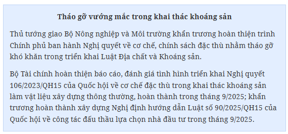 Bộ Nông nghiệp và Môi trường chủ trì giải quyết các khó khăn về nguồn vật liệu cho các dự án trong danh mục dự án thuộc Ban Chỉ đạo do Bộ Quốc phòng làm cơ quan chủ quản, hoàn thành trong tháng 10/2025.