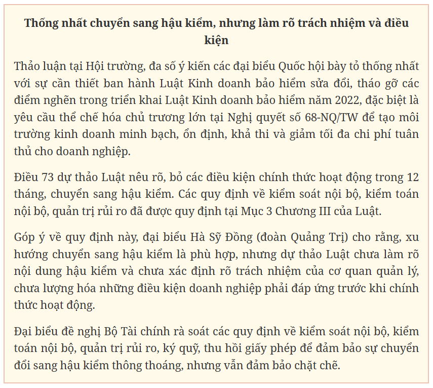 Đồng quan điểm, đại biểu Phạm Thị Kiều cũng đề nghị, cần ngăn ngừa xung đột lợi ích, bảo đảm chất lượng tư vấn và tính chuyên nghiệp, kiểm soát nghiệp vụ và tăng cường công tác quản lý nhà nước đối với hoạt động của các đại lý và bảo vệ quyền lợi của người tham gia bảo hiểm.