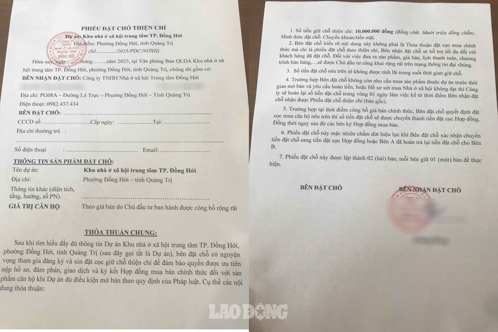 Ông K khẳng định “gần 100 người đã đặt chỗ”, mỗi suất 10 triệu đồng và nhấn mạnh “đặt sớm sẽ được chọn căn đẹp”. Ông K vẫn thông báo ngày 19.12.2025 sẽ khởi công. Cuối buổi, ông đưa phiếu “đặt chỗ thiện chí” có sẵn dấu đỏ và chữ ký đại diện Công ty TNHH Nhà ở xã hội Trung tâm Đồng Hới.