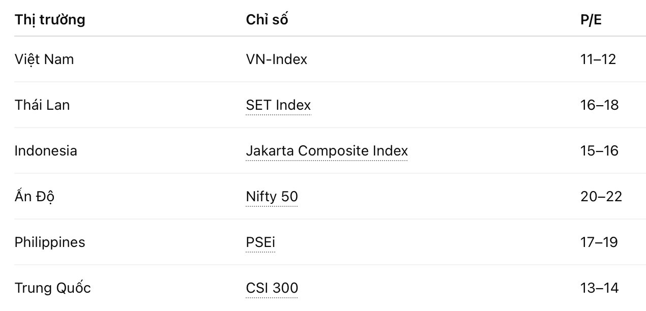 Bên cạnh đó, chứng khoán Việt Nam có định giá hấp dẫn với P/E trailing khoảng 12 lần, thấp hơn nhiều so với các thị trường mới nổi khác. So với chỉ số thị trường mới nổi toàn cầu như MSCI Emerging Markets Index có P/E khoảng 14–15 lần, mức định giá của TTCK Việt Nam là tương đối rẻ. Trong khi đó, tốc độ tăng trưởng kinh tế của Việt Nam duy trì ở mức cao so với các nước trong khu vực.