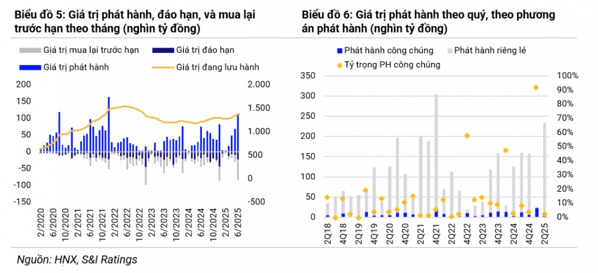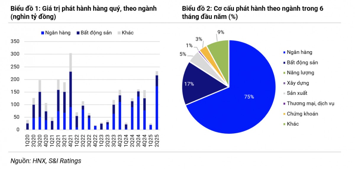 "Hoạt động phát hành mới đã tăng tốc trở lại trong quý 2 sau giai đoạn trầm lắng thường thấy vào quý 1. Lũy kế 6 tháng đầu năm, tổng quy mô phát hành trái phiếu đạt 258 nghìn tỷ đồng, tăng 67% so với cùng kỳ năm 2024, cho thấy tín hiệu phục hồi rõ rệt của thị trường," S&I Ratings nhận định.