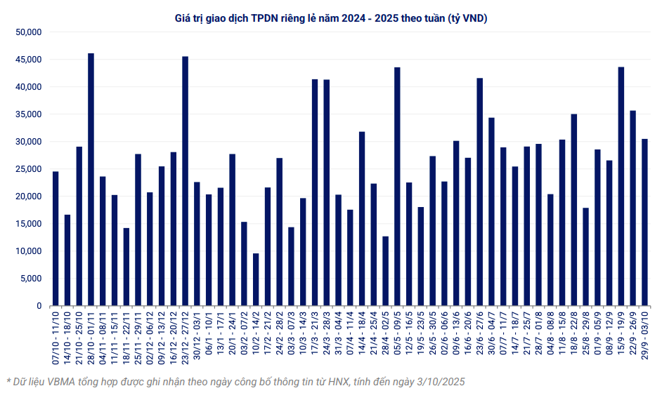 Về giao dịch thứ cấp, giá trị giao dịch bình quân trái phiếu doanh nghiệp riêng lẻ đạt 6.094 tỷ đồng mỗi ngày, giảm 14,5% so với tuần trước. Lũy kế từ đầu năm, tổng giá trị giao dịch trái phiếu riêng lẻ đạt khoảng 1,024 triệu tỷ đồng, cho thấy thanh khoản thị trường vẫn duy trì tích cực, dù có sự phân hóa giữa các nhóm ngành.