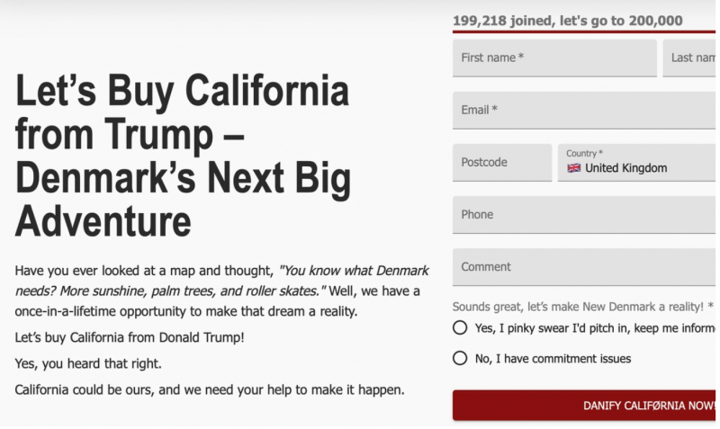 Đáp trả việc đòi mua Greenland của Tổng thống Mỹ Donald Trump, hơn 200.000 người Đan Mạch đã ký vào một bản kiến nghị mang màu sắc châm biếm, lập ra với mục tiêu huy động 1.000 tỷ USD từ cộng đồng, nhằm giúp nước này mua lại tiểu bang California của Mỹ.