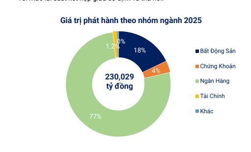 Trong đó, ngành ngân hàng tiếp tục dẫn đầu về giá trị phát hành với 71.701 tỷ đồng. Tiếp theo là ngành bất động sản với 12.922 tỷ đồng, ngành tài chính với 1.300 tỷ đồng, ngành chứng khoán với 500 tỷ đồng, ngành xây dựng 320 tỷ đồng và ngành nông nghiệp hút về 210 tỷ đồng.