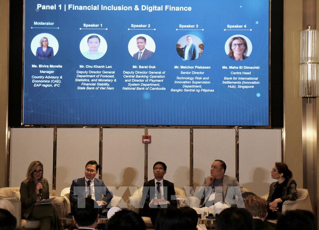 Các chuyên gia tham gia thảo luận với chủ đề "Mở rộng tiếp cận tài chính & Tài chính kỹ thuật số" tại hội nghị. Ảnh: Hứa Chung - TTXVN