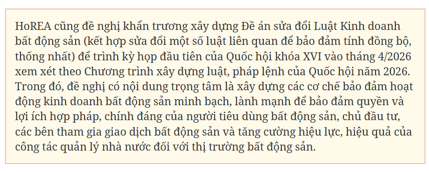 Mặc dù không tán đồng việc thành lập Trung tâm Giao dịch bất động sản, nhưng tại thời điểm hiện nay, HoREA cho biết, rất cần thiết xây dựng Dự thảo Nghị quyết của Chính phủ về bổ sung quy định bắt buộc chủ đầu tư dự án bất động sản trước khi đưa ra giao dịch thì phải công khai đầy đủ, chính xác thông tin sản phẩm bất động sản.