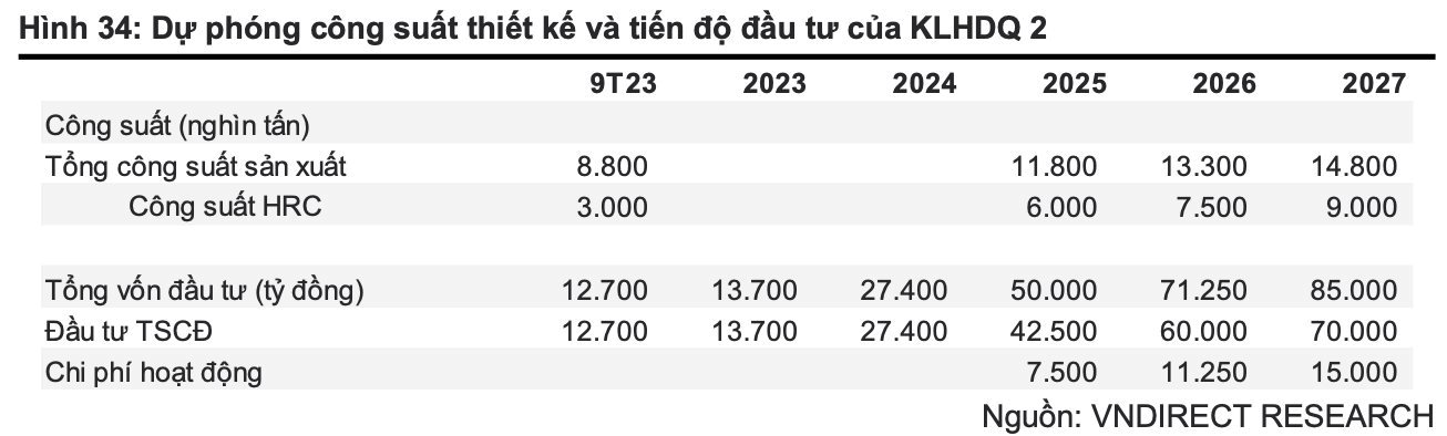 VNDirect kỳ vọng Hòa Phát sẽ đẩy nhanh tiến độ xây dựng trong giai đoạn 2024-25 để đảm bảo việc tăng công suất sản xuất HRC từ 3 triệu tấn hiện tại lên 6 triệu tấn trong nửa cuối năm 2025 (50% công suất thiết kế sẽ được đưa vào vận hành từ giai đoạn 1 của KLH Dung Quất 2). Sau khi được vận hành tối đa, dự án sẽ nâng cao triển vọng tăng trưởng của Hòa Phát giai đoạn 2025-27 với tốc độ tăng trưởng kép ước tính 30% khi bổ sung thêm 6 triệu tấn HRC vào công suất hiện tại.