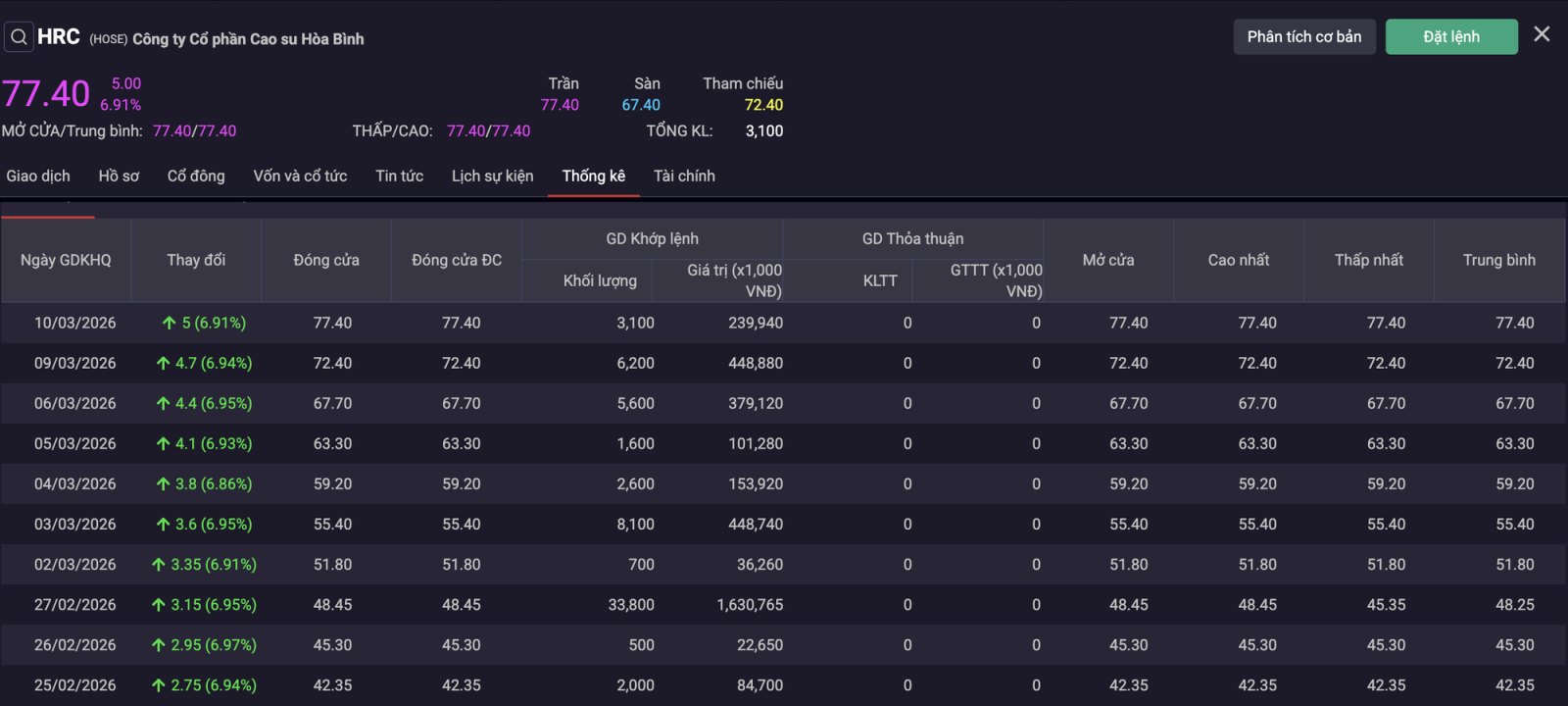 Từ ngày 3/3 đến ngày 9/3, ghi nhận cổ phiếu HRC tăng gần 31%. Chốt phiên các ngày tăng từ từ 55.400 lên 72.400 đồng/cổ phiếu. Đến phiên giao dịch 10/03, đà tăng trần của HRC vẫn chưa dừng lại. Mã này kết phiên với mức tăng kịch biên độ, đạt 77,400 đồng/cổ phiếu.