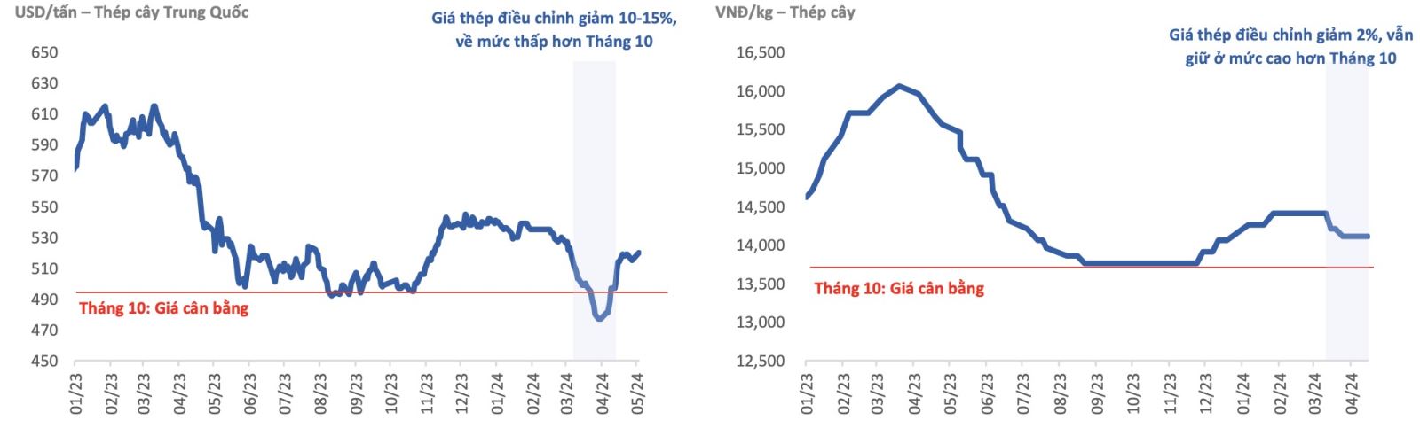 Bên cạnh đó, do ngành thép Việt Nam nhập khẩu nguyên vật liệu để sản xuất, nên, giá thép nội địa thường biến động tương đương hoặc mạnh hơn giá thép thế giới, đặc biệt là Trung Quốc. Tuy nhiên, biên độ giảm giá thép tại Việt Nam trong giai đoạn từ tháng 2 - tháng 4/2024 tương đối hẹp, chỉ khoảng 2% và vẫn giữ ở mức cao hơn vùng đáy (hay còn được xem là vùng giá cân bằng) của tháng 10/2023 và tháng 11/2022.