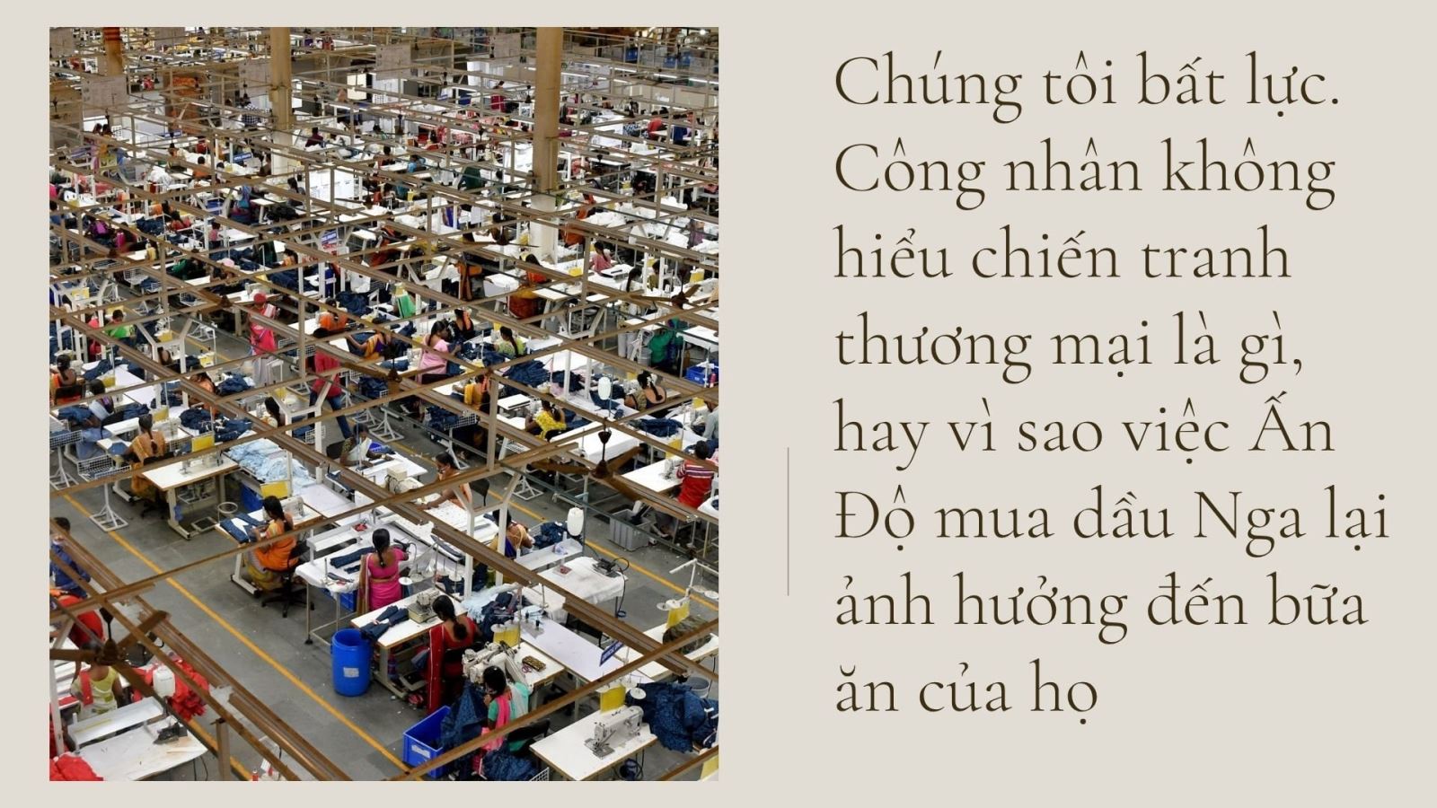 “Chúng tôi bất lực”, ông Kumar Duraiswamy, Giám đốc điều hành công ty Eastern Global Clothing, nói. “Công nhân của tôi không hiểu chiến tranh thương mại là gì, hay vì sao việc Ấn Độ mua dầu Nga lại ảnh hưởng đến bữa ăn của họ”.