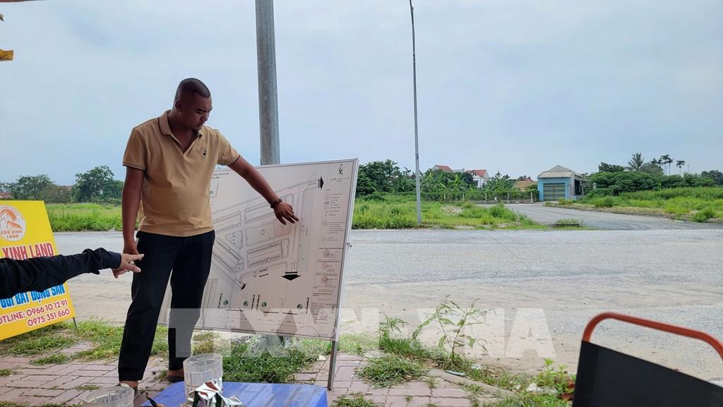Môi giới bất động sản giới thiệu về các ô đất. Ảnh Mạnh Khánh-TTXVN