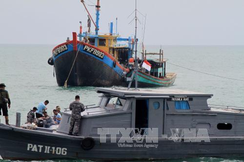 Nhà chức trách Indonesia lai dắt một tàu đánh cá trái phép của Malaysia tại khu vực ngoài khơi Belawan, phía đông đảo Sumatra, Indonesia. Ảnh tư liệu: AFP/TTXVN