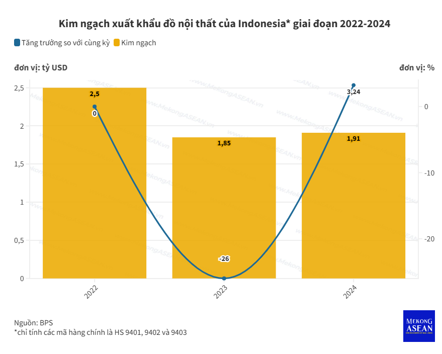 Số liệu của Cơ quan Thống kê Indonesia (BPS) chỉ ra, giá trị xuất khẩu của ngành đồ nội thất Indonesia đối với mã hàng HS 9401, 9402 và 9403 trong giai đoạn từ tháng 1 đến tháng 12/2024 đạt 1,91 tỷ USD, tăng 3,24% so với cùng kỳ năm 2023 là 1,85 tỷ USD, theo bà Reni Yanita.