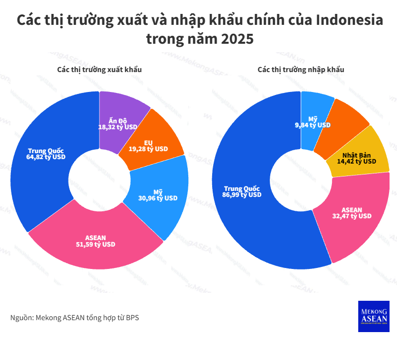 Về thị trường, Trung Quốc tiếp tục là đối tác thương mại lớn nhất của Indonesia. Trong năm 2025, Indonesia đã xuất khẩu 64,82 tỷ USD hàng hoá sang Trung Quốc, tăng 7,11% so với năm trước; bỏ xa thị trường xuất khẩu lớn thứ hai là Mỹ với kim ngạch 30,96 tỷ USD.