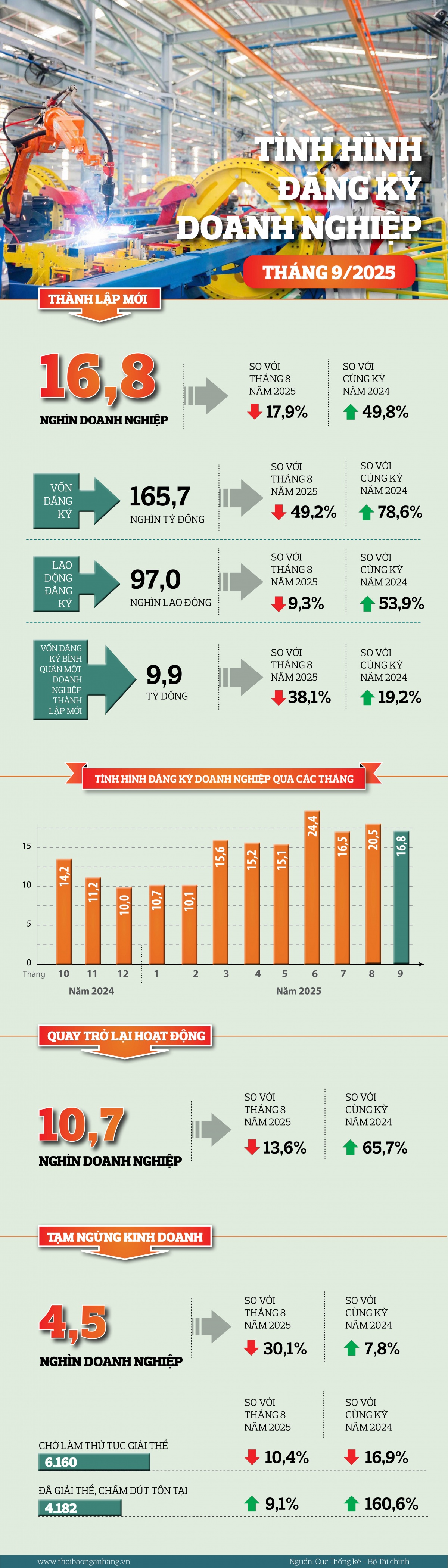 Tháng 9 ghi nhận 16,8 nghìn doanh nghiệp thành lập mới với tổng vốn đăng ký 165,7 nghìn tỷ đồng, tăng mạnh so với cùng kỳ năm trước. Cùng với hơn 10,7 nghìn doanh nghiệp quay lại hoạt động, khu vực kinh doanh trong nước tiếp tục cho thấy tín hiệu phục hồi rõ nét.