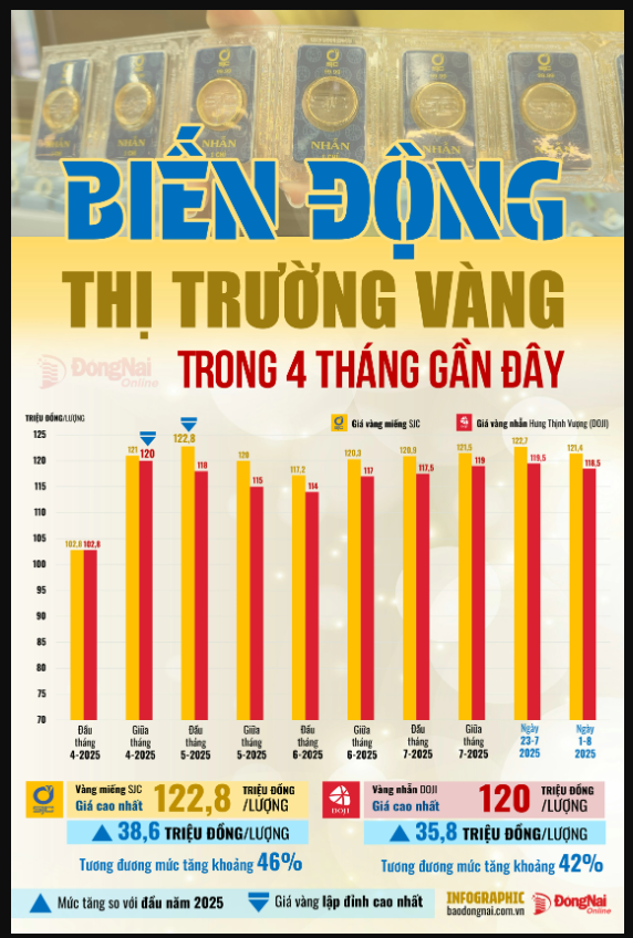 Giá vàng miếng SJC có thời điểm lập đỉnh vào đầu tháng 5-2025 với mức giá 122,8 triệu đồng/lượng ở chiều bán ra. Mức giá tăng khoảng 46% so với thời điểm đầu năm 2025. Những tháng sau đó giá vàng miếng liên tục trồi sụt. Đến khoảng cuối tháng 7, có thời điểm giá vàng miếng SJC tăng mạnh trở lại chạm mốc 122,7 triệu đồng/lượng ở chiều bán ra, xấp xỉ mức giá kỷ lục hồi tháng 5-2025. Đến đầu tháng 8, giá vàng miếng SJC có xu hướng “hạ nhiệt” còn khoảng 121,4 triệu đồng/lượng.