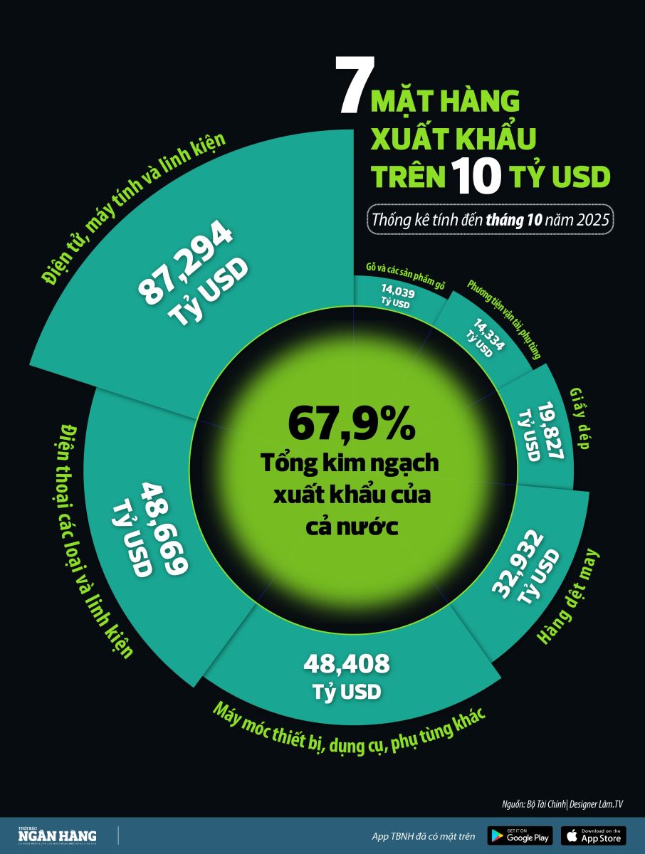 Bảy nhóm hàng chủ lực chiếm 67,9% tổng kim ngạch xuất khẩu của Việt Nam trong 10 tháng năm 2025, với điện tử dẫn dắt cuộc đua. Điện tử, máy tính và linh kiện: 87,294 tỷ USD. Điện thoại các loại và linh kiện: 48,669 tỷ USD. Máy móc, thiết bị, dụng cụ, phụ tùng: 48,408 tỷ USD. Hàng dệt may: 32,932 tỷ USD. Các nhóm hàng còn lại tiếp tục duy trì trên mốc 10 tỷ USD mỗi nhóm, đóng góp đáng kể vào tổng kim ngạch xuất khẩu của cả nước. Bức tranh xuất khẩu cho thấy các ngành công nghệ và công nghiệp chế tạo vẫn là đầu tàu, trong khi dệt may giữ vai trò trụ cột của khu vực sản xuất truyền thống.