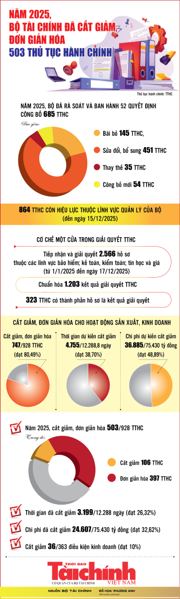 Theo Bộ Tài chính, năm 2025, Bộ đã thực thi cắt giảm, đơn giản hóa 503/928 thủ tục hành chính (TTHC). Trong đó, cắt giảm 106 TTHC, đơn giản hóa 397 TTHC. Tổng thời gian đã cắt giảm là 3.199/12.288 ngày, đạt tỷ lệ 26,32%; chi phí đã cắt giảm là 24.607/75.430 tỷ đồng, đạt tỷ lệ 32,62%.