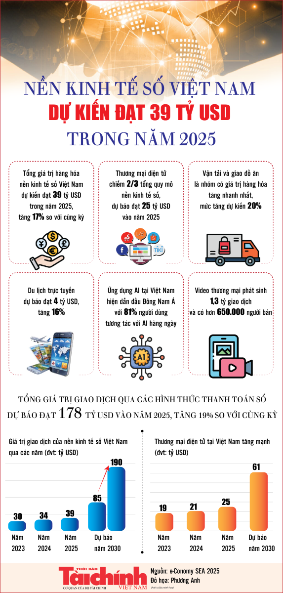 Theo báo cáo thường niên Kinh tế số khu vực Đông Nam Á (e-Conomy SEA 2025) công bố ngày 25/11, nền kinh tế số Việt Nam được dự báo đạt 39 tỷ USD trong năm 2025, tăng trưởng hai con số ở tất cả lĩnh vực. Cùng với đó, người dùng Việt Nam thể hiện mức độ chủ động và tin tưởng vào AI cao nhất Đông Nam Á, mở ra triển vọng phát triển mới cho nền kinh tế số.